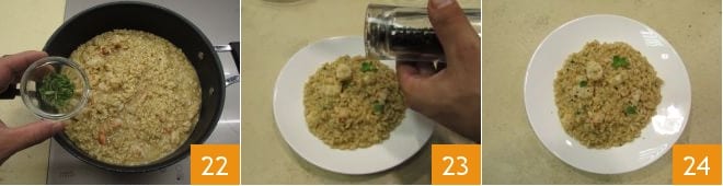 Complétez avec de l'origan frais haché 22 et ajoutez encore quelques gouttes de bouillon pour obtenir la consistance que vous préférez. Dressez, râpez un peu de poivre noir sur chaque assiette 23 et servez votre risotto à la réglisse et aux crevettes encore chaud 24 !