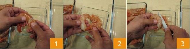 Pour préparer le risotto à la réglisse et aux crevettes, commencez par nettoyer ces dernières. Détachez d'abord la tête 1, puis retirez également les pattes et la carapace 2, en gardant tout de côté. À ce stade, incisez le dos de chaque crevette 3 et retirez le filament noir. Pour d'autres conseils, consultez notre école de cuisine : Comment nettoyer les crevettes.
