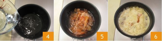 Puis versez de l'eau dans une casserole 4, ajoutez les têtes et les carapaces 5 et salez, puis portez à ébullition 6 et attendez environ 5 minutes.