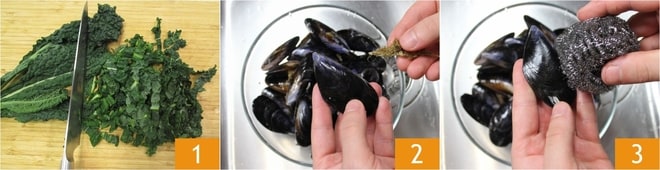 Pour réaliser le risotto au chou noir et moules, commencez par couper le chou noir en lanières, en éliminant les tiges les plus coriaces 1. Passez au Comment nettoyer et ouvrir les moules : tout d'abord, écartez celles qui sont cassées ou ouvertes, puis enlevez les incrustations avec un couteau, arrachez la barbe 2 et grattez la coquille avec une paille de fer 3.