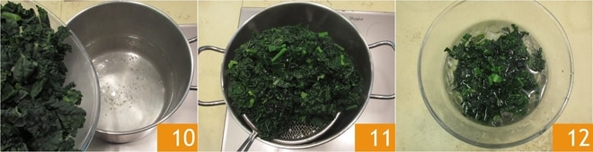 Entre-temps, portez à ébullition une casserole d'eau et blanchissez le chou noir pendant environ 5 minutes 10. Égouttez-le sans jeter l'eau de cuisson (gardez-la au chaud, elle servira à cuire le risotto) 11 et transférez-le dans un bol avec de l'eau glacée, pour conserver sa couleur vive 12.