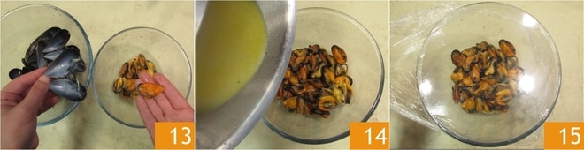 Décortiquez les moules 13. Mettez les mollusques dans un bol avec une partie de leur liquide de cuisson 14; le liquide restant vous servira à cuire le riz. Couvrez de film plastique et réservez 15.