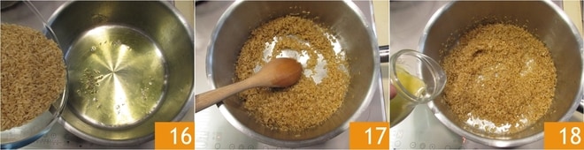 À ce stade, vous pouvez commencer la préparation du risotto: faites griller le riz complet dans une casserole avec un filet d'huile pendant 4-5 minutes 16, en remuant souvent 17. Déglacez avec le liquide des moules mis de côté 18.