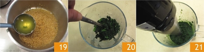 Portez le riz à cuisson en ajoutant le bouillon chaud de chou noir, une louche à la fois 19. Pendant ce temps, égouttez le chou noir et transférez-le dans un récipient 20, puis mixez-le avec un mixeur plongeant pour obtenir une crème 21.