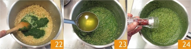 Quand il restera 5 minutes de cuisson du riz, ajoutez la crème de chou noir 22. Mélangez bien et finissez de cuire le risotto en ajoutant plus de bouillon si besoin 23. Une fois prêt, assaisonnez avec le poivre rose 24.