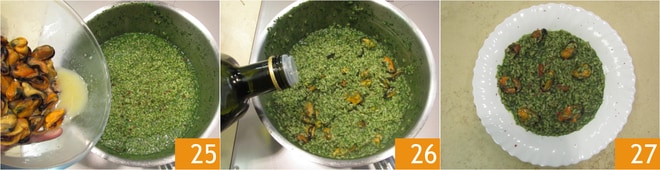 Ajoutez les moules 25 et mélangez délicatement, puis éteignez le feu et mélangez avec un filet d'huile crue 26. Votre risotto au chou noir et moules est prêt à être servi 27 !