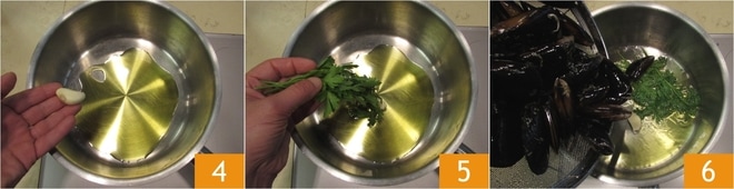 Dans une grande casserole, chauffez l'huile avec l'ail 4, faites revenir un beau bouquet de persil 5. Ajoutez ensuite les moules 6.