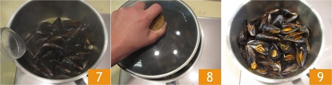 Déglacez avec le vin blanc 7, couvrez avec le couvercle 8 et faites cuire à feu vif pendant 4-5 minutes, en secouant la casserole de temps en temps. Lorsque toutes les moules seront ouvertes, éteignez le feu et laissez refroidir 9. Retirez également le bouquet de persil.