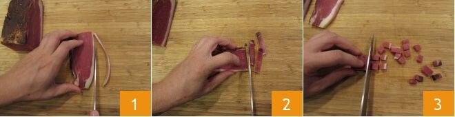 Pour préparer le risotto aux pommes et speck, commencez par préparer le bouillon de légumes et maintenez-le au chaud. Ensuite, coupez des tranches de speck épaisses d'environ 2 cm, éliminez la couenne 1, et contre la fibre, découpez d'abord des bâtonnets 2 et enfin des cubes 3.