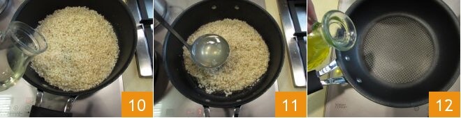 Faites-le griller pendant quelques minutes, en remuant constamment, puis déglacez avec le vin blanc 10. Attendez que l'alcool se soit complètement évaporé et commencez à mouiller le riz avec le bouillon chaud 11, en continuant à le faire uniquement au besoin. Dans une autre casserole bien chaude, versez un filet d'huile 12.