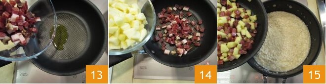 Ajoutez ensuite à la fois le speck 13 et les pommes 14 et faites-les sauter à feu vif jusqu'à ce qu'ils soient dorés. Lorsqu'il reste environ 3 minutes de cuisson au risotto, versez les pommes et le speck à l'intérieur 15, poivrez à votre goût.