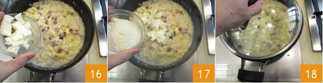 Dès que le riz est cuit, éteignez le feu et ajoutez le reste de beurre 16 et le Parmigiano, en le saupoudrant sur toute la surface 17. Couvrez avec un couvercle 18, attendez 1 minute