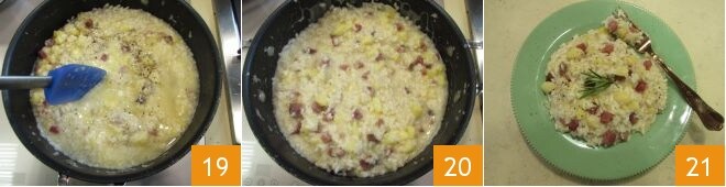 et liez le risotto en remuant doucement et en secouant la poêle pour terminer la liaison (19-20). Votre risotto aux pommes et speck est prêt, garnissez de quelques brins de romarin et servez 21.