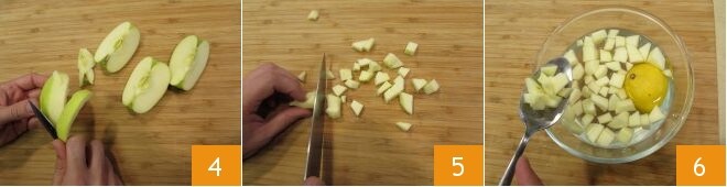 Passez ensuite aux pommes, coupez-les en 4, puis épluchez-les 4 et découpez des cubes de la même taille que ceux du speck 5. Pour éviter qu'ils ne noircissent, trempez-les au fur et à mesure dans de l'eau acidulée 6.