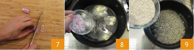 Ensuite, préparez le soffritto. Émincez finement l'échalote 7 et mettez-la dans une casserole où vous aurez déjà fait fondre la moitié du beurre 8, l'autre moitié sera utilisée pour lier le risotto ensuite. Laissez l'échalote ramollir légèrement, en remuant souvent, cela prendra environ 5 minutes (vous pouvez mouiller avec une louche de bouillon chaud). Après cela, versez le riz à l'intérieur 9.