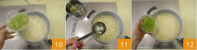 Laissez-le griller quelques minutes : dès que les grains deviennent transparents, vous pouvez déglacer avec le jus de raisin 10. Une fois évaporé, ajoutez le bouillon de légumes chaud et déjà salé, louche par louche, jusqu'à ce que la cuisson soit terminée. N'oubliez pas de ne pas trop remuer le riz 11. À la fin de la cuisson, éteignez le feu et mélangez le risotto en ajoutant les grains de raisin épépinés et coupés pour certains en deux et pour d'autres en quatre 12,