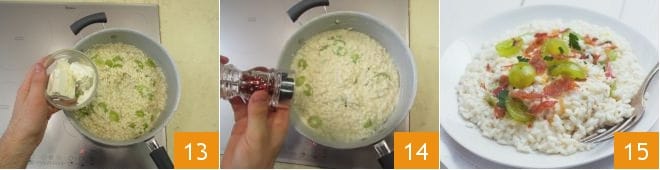 puis la robiola, une pincée de poivre rose et mélangez bien 14. Dressez dans les assiettes puis garnissez chaque assiette avec un peu de jambon cru émietté à la main et de persil haché. Votre risotto aux raisins est prêt, bon appétit !