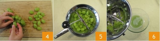 Continuez en rinçant les raisins, puis détachez les grains 4 et versez-les dans un moulin à légumes 5; n'oubliez pas d'en garder quelques-uns de côté pour la décoration. Passez les autres pour obtenir le jus et mettez de côté 6.