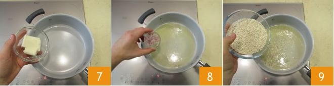 Faites fondre le beurre dans une grande casserole à feu très doux 7 puis ajoutez l'échalote hachée en la laissant fondre pendant une dizaine de minutes 8. Remuez souvent à ce stade. Si elle sèche trop vite, ajoutez quelques cuillères à soupe de bouillon chaud. Après ce temps, augmentez un peu le feu et ajoutez le riz 9.