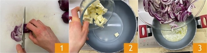 Pour préparer le risotto avec crème d'oignons et noisettes, commencez par préparer le bouillon de légumes et gardez-le au chaud. Épluchez et émincez les oignons rouges 1. Dans une casserole chaude, versez le beurre en morceaux 2. Lorsqu'il est fondu, ajoutez les oignons 3.