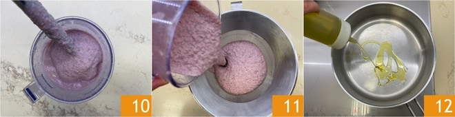Mixez avec un mixeur plongeant jusqu'à obtenir une crème lisse et veloutée 10. Passez la crème au tamis 11 pour la rendre plus homogène. Passez à la cuisson du riz : dans une casserole, chauffez un filet d'huile 12.