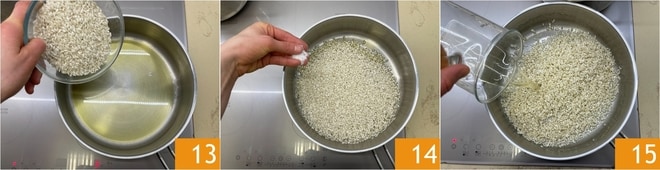 Versez le riz 13 et salez 14. Lorsque le riz est bien grillé et chaud, déglacez avec du vin blanc 15 et laissez évaporer.