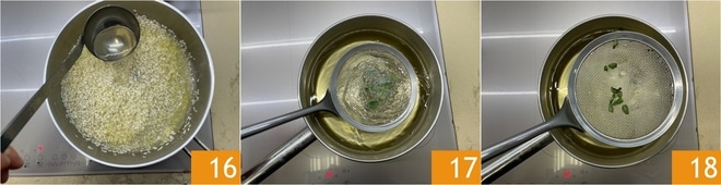 Faites cuire pendant 10 minutes en ajoutant le bouillon peu à peu; assurez-vous toujours que le liquide est à ébullition et que le précédent a été absorbé 16. Pendant ce temps, faites frire les feuilles de sauge dans l'huile de graines chaude à 170° juste le temps de les rendre croustillantes, puis égouttez-les 18.