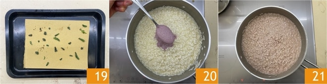 Disposez-les sur un plateau recouvert de papier absorbant pour sécher l'huile 19 et réservez. Après les 10 minutes de cuisson du riz, versez la crème d'oignons dans la casserole 20 et continuez à cuire pendant encore 2 minutes. Éteignez le feu 21.