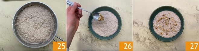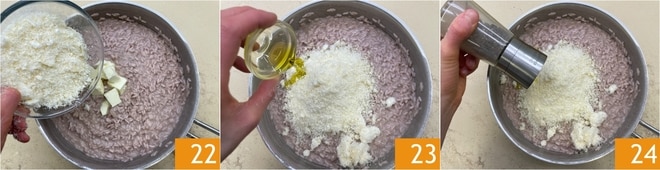 Liez avec du Parmigiano Reggiano râpé, du beurre froid 22 et de l'huile 23. Enfin, poivrez à votre goût 24.