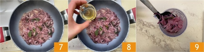 Les oignons doivent être tendres et secs 7. Déglacez avec le vinaigre de vin blanc 8 et laissez évaporer, puis transférez les oignons dans un récipient 9.