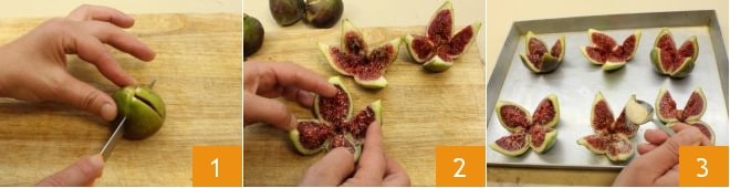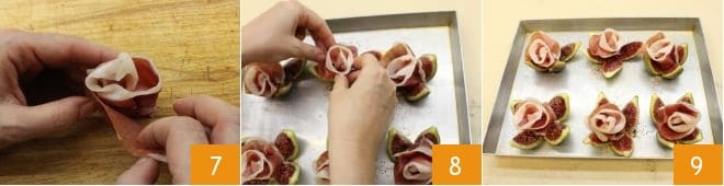 en créant ainsi les rosaces 7. Placez chaque rosace au centre de chaque figue (8-9) et servez immédiatement cet apéritif délicieux!
