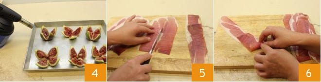puis déposez les figues ainsi ouvertes sur une plaque et caramélisez la surface pendant quelques instants avec un chalumeau 4 (si vous ne disposez pas de chalumeau, vous pouvez les mettre sous le gril du four pendant quelques minutes jusqu'à ce que le sucre soit fondu). Entre-temps, prenez les tranches de jambon qui ne doivent pas être trop fines, sinon vous ne pourrez pas créer les rosaces. Divisez chaque tranche en deux parts égales 5 et enroulez ensuite chaque moitié sur elle-même 6