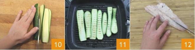 Passez maintenant aux courgettes : lavez-les et coupez-les en tranches très fines dans le sens de la longueur 10, puis grillez-les quelques minutes de chaque côté sur une plaque brûlante 11. Procédez maintenant à la formation des roulades. Tout d'abord, effectuez une incision verticale au centre de chaque filet, pour obtenir de chacun 2 petits filets plus étroits 12.