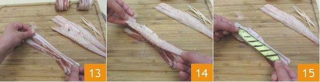Disposez ensuite sur la planche à découper, l'une sur l'autre, 3 tranches de pancetta 13 et posez dessus un petit filet 14. Sur le petit filet, posez enfin une tranche de courgette grillée 15.