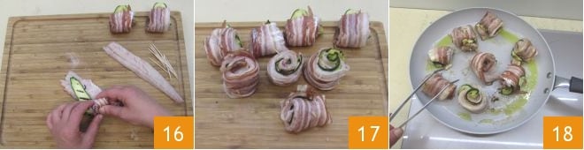 Roulez la pancetta, le petit filet et la courgette sur eux-mêmes pour former vos roulades 16 et fixez-les avec un cure-dent pour éviter qu'elles ne s'ouvrent 17. Chauffez l'huile dans une grande poêle antiadhésive, et, lorsqu'elle est bien chaude, faites dorer les roulades pendant 2-3 minutes, en les retournant souvent sur tous les côtés à l'aide d'une paire de pinces 18.