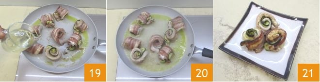Assaisonnez de sel et de poivre, puis déglacez avec le prosecco 19. Attendez que le vin s'évapore : à ce moment-là, les roulades seront prêtes 20. Dressez et dégustez les roulades de filets de bar avec pancetta fumée et courgettes grillées au Prosecco bien chaudes 21.