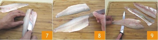Retournez le poisson et répétez le processus de l'autre côté pour obtenir le deuxième filet. Avec un couteau aiguisé, enlevez la partie centrale et rougeâtre des filets 7 et avec les pinces appropriées, retirez les arêtes restantes 8. En maintenant le couteau horizontal, séparez enfin la chair de la peau 9. Répétez avec le deuxième bar pour obtenir également 2 filets sans peau.