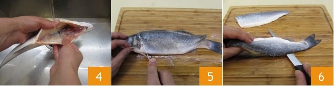 puis rincez soigneusement sous l'eau courante pour éliminer le sang et les éventuels résidus 4. Ensuite, retournez sur la planche à découper, enlevez la tête 5 et puis, en maintenant le couteau parallèle au plan de travail, effectuez une incision profonde le long de l'arête du bar, le long de l'os, afin de séparer le premier filet 6.