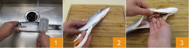 Pour préparer les roulades de filets de bar, commencez par nettoyer les poissons. Prenez le premier bar, placez-le dans l'évier sous l'eau courante puis, avec l'appareil à écailler, enlevez les écailles 1. Effectuez ensuite une incision le long du ventre du poisson jusqu'à la tête, en utilisant une paire de ciseaux 2. Enlevez les entrailles 3,