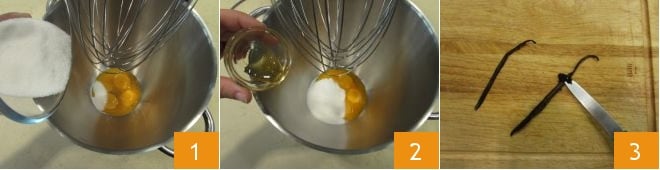 Pour préparer le roulé sans gluten au cacao et pêches, commencez par la pâte biscuit sans gluten. Séparez les jaunes des blancs d'œufs ; montez les premiers avec 100 g de sucre 1 et ajoutez-y également le miel 2 et les graines d'une demie gousse de vanille, prélevées avec la pointe d'un couteau 3.