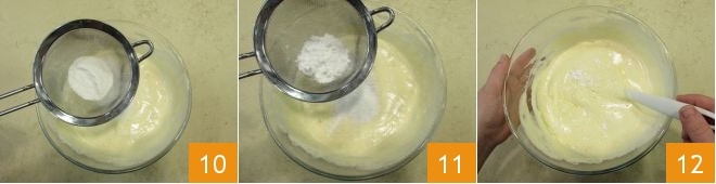 À ce stade, tamisez, dans le bol, la farine de riz 10 et la fécule de pommes de terre 11. Mélangez en effectuant des mouvements de bas en haut 12.