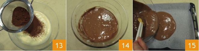 Ajoutez maintenant le cacao tamisé 13 et mélangez avec une spatule pour obtenir un mélange lisse et homogène 14. Versez-le dans un moule de dimensions 37x30 cm tapissé de papier sulfurisé 15.