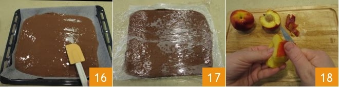 Nivelez la pâte avec une spatule 16 et faites cuire dans un four statique préchauffé à 200 degrés pendant 8 minutes. Une fois le temps de cuisson écoulé, transférez la pâte biscuit sur un plan, en gardant le papier sulfurisé en dessous ; saupoudrez la surface de sucre semoule et scellez-la, encore chaude, avec du film plastique en contact 17 pour retenir toute l'humidité à l'intérieur et éviter qu'elle ne se casse lors du roulage. Laissez-la refroidir complètement et, en attendant, préparez la garniture du roulé. Coupez les pêches en deux, dénoyautez-les et épluchez-les avec l'aide d'un petit couteau 18.