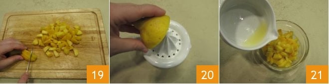 Découpez des dés pas trop gros 19 et transférez-les dans un bol ; pressez du jus de citron 20 et versez-le sur les pêches pour éviter qu'elles ne s'oxydent 21.