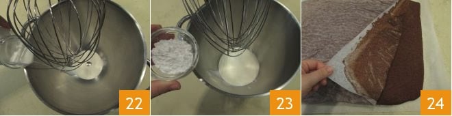 Versez la crème sans lactose bien froide dans un bol 22, ajoutez le sucre glace 23 et montez-la. Quand la pâte biscuit est complètement refroidie, retirez le film plastique et retournez-la, avec son papier sulfurisé, sur une nouvelle feuille de papier sulfurisé ; puis soulevez avec beaucoup de délicatesse le papier sulfurisé de la cuisson 24.