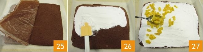 Retirez-le avec soin 25 et procédez à la garniture du roulé en étalant une couche de crème fouettée sans lactose 26. Saupoudrez dessus les dés de pêche préalablement préparés 27.