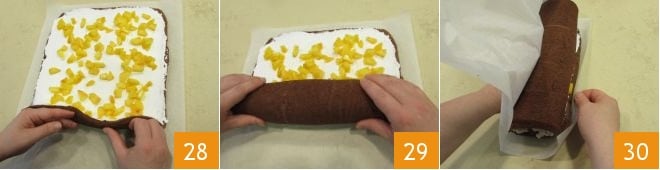 Roulez la pâte biscuit en commençant par le côté court (28-29), puis enroulez-la bien avec la feuille de papier sulfurisé en dessous 30