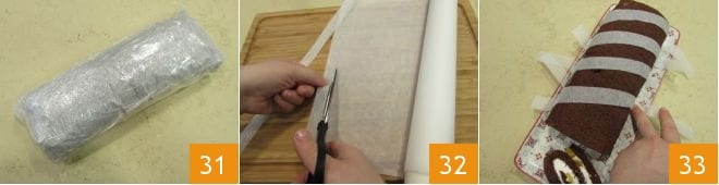 et scellez-la avec du film plastique 31. Laissez reposer le roulé au réfrigérateur pendant au moins 2 heures, ainsi il se compactera et sera plus facile à couper en tranches. Découpez des bandes de papier sulfurisé d'environ 1,5 cm de large et d'environ 20 cm de long 32. Une fois que le roulé est bien froid, sortez-le du frigo, retirez le film et le papier sulfurisé, et disposez dessus les bandes de papier sulfurisé précédemment découpées 33 créant un motif de rayures obliques.