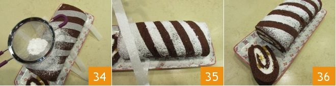 Saupoudrez le roulé d'une bonne quantité de sucre glace 34, retirez une à une les bandes de papier sulfurisé 35 et découpez en tranches 36. Votre roulé sans gluten au cacao et pêches est prêt à être dégusté !