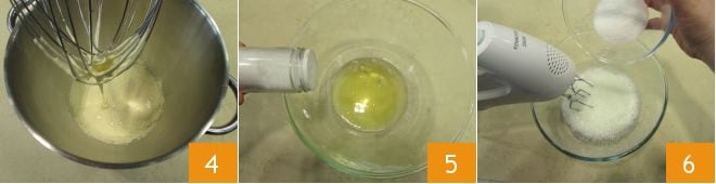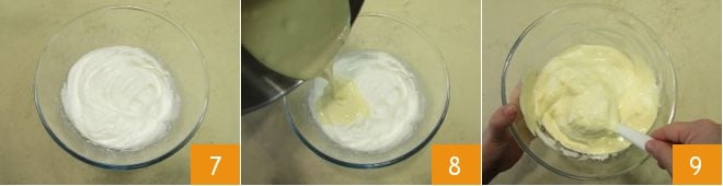 Montez les blancs jusqu'à obtenir une consistance brillante et pas trop ferme 7. Ensuite, incorporez le mélange de jaunes à celui des blancs 8, en mélangeant délicatement de bas en haut pour ne pas les dégonfler 9.